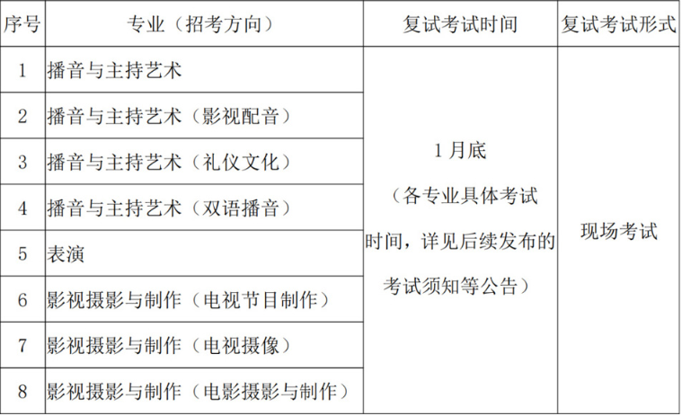 播音与主持艺术方向需考察文学作品表达(自备古诗词)、新闻播音(自选汉语新闻)及创意主持;影视配音方向增加演播片断展示(小说、广播剧等任选);礼仪文化方向考察现代散文表达与才艺展示;双语播音方向则需完成英语与汉语新闻播读及英语模拟主持,各环节均有严格时长限制(1-3分钟)。复试为现场考试,将进一步考察专业深度能力,具体科目后续公布。