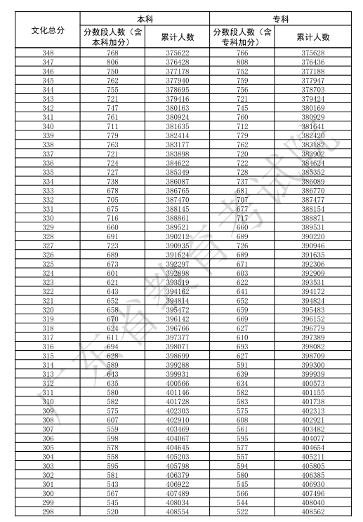 高考一分一段,是以“1分”为阶梯单位,统计获得该分数的考生人数和累计人数,一分一段表可以让考生对每一个分数段上有多少人一目了然。
