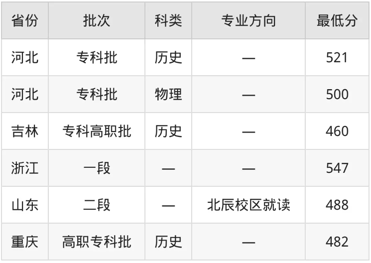 2024年录取线:天津338分(专科批),河北物理组402分。2025年选考科目要求为物理/历史均可。